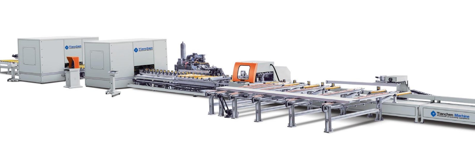 主要用于鋁模板中標(biāo)準(zhǔn)平面模板(樓面板、墻板)鋁型材的鋸切下料、兩側(cè)面沖孔 和銑槽的全自動(dòng)高效加工??蓾M足拉片式鋁模板鋸沖銑工序或拉桿式鋁模板鋸沖工序的 批量快速生產(chǎn)。